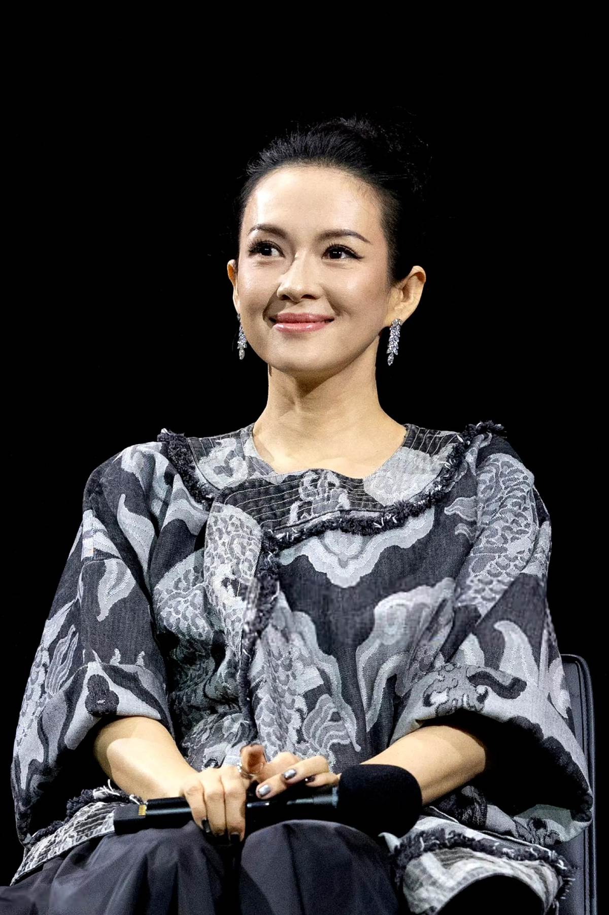 章子怡這一次相當低調,搭配一件灰色帶有花紋的寬松長袖衫,下半身則是一條黑色裙子,髮型還是一如既往的盤起來。
