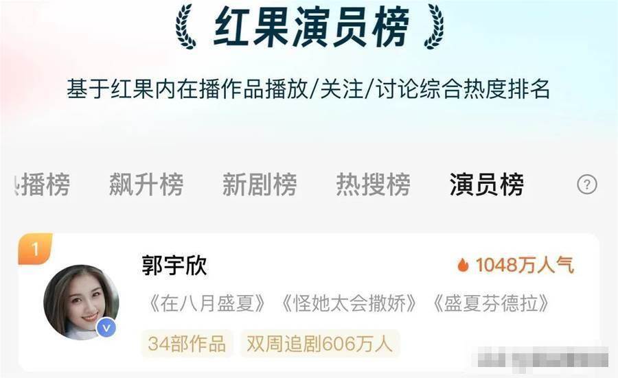 郭宇欣爆火之后,人氣和熱度更是一路飆升,整個十月一直霸榜紅果演員榜榜首第一的高位,至今還無人超越。