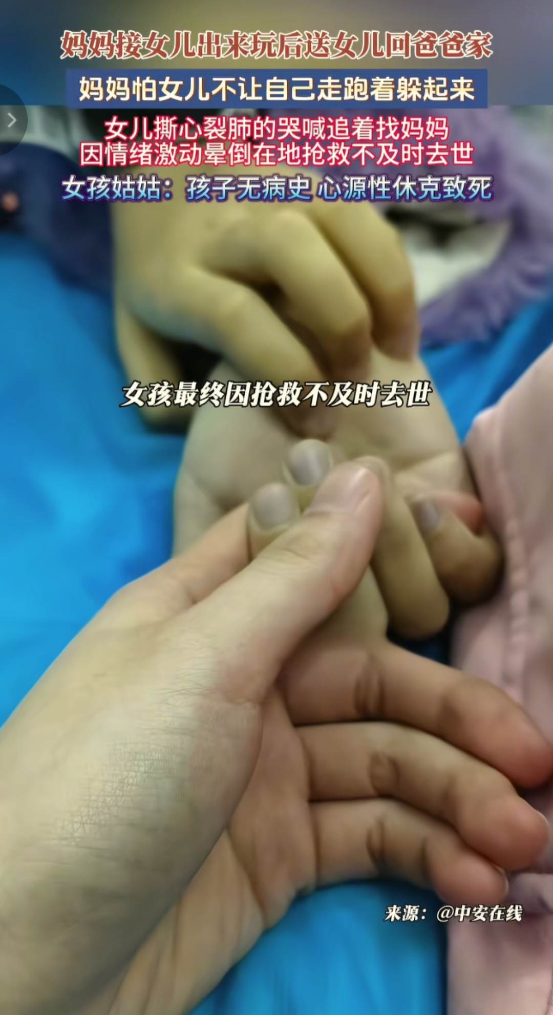 雖然最後孩子被送往醫院但還是因送醫不及時搶救無效死亡,根據醫生的診斷孩子是死于心源性休克,但據孩子的姑姑透露小孩並沒有心臟病史