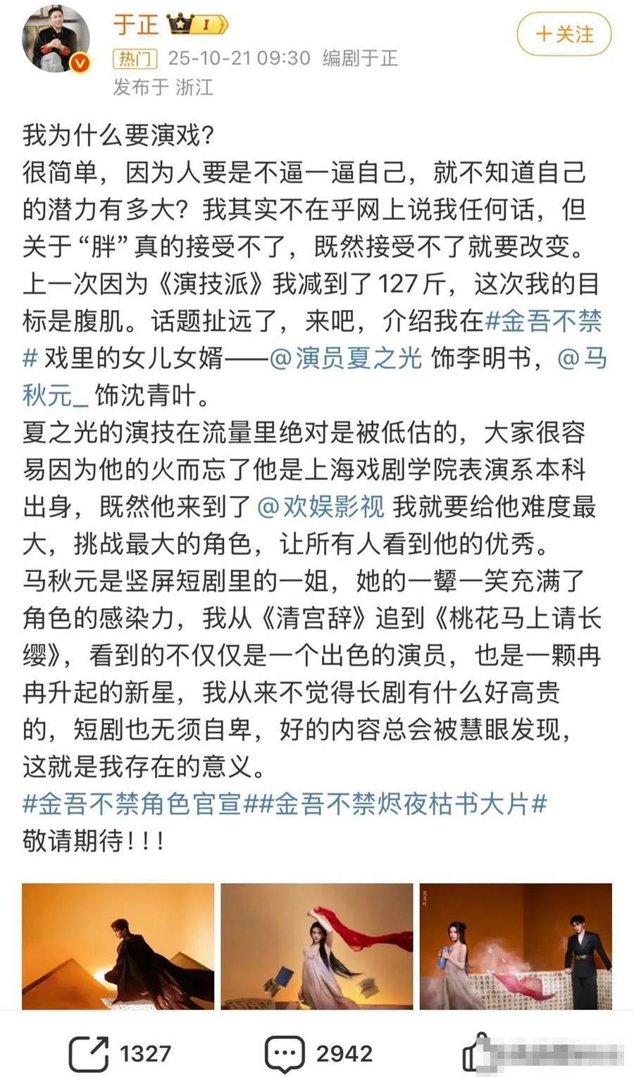 于正同時也發文說道:馬秋元是豎屏短劇里的一姐,她的一顰一笑充滿了角色的感染力,我從《清宮辭》追到《桃花馬上請長纓》,看到的不僅僅是一個出色的演員,也是一顆冉冉升起的新星,我從來不覺得長劇有什麼好高貴的,短劇也無須自卑,好的內容總會被慧眼發現,這就是我存在的意義。