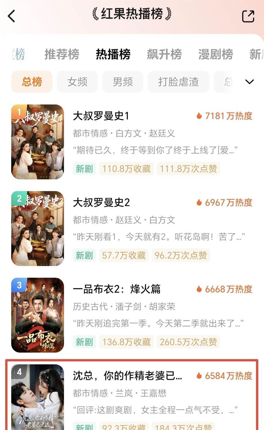 從被群嘲到被肯定演技,蘭嵐用一部新劇完成了口碑逆襲。目前該劇憑藉6584萬的熱度排名紅果熱播榜第四的位置,僅次于《大叔羅曼史》和《一品布衣2》,成績相當不錯!