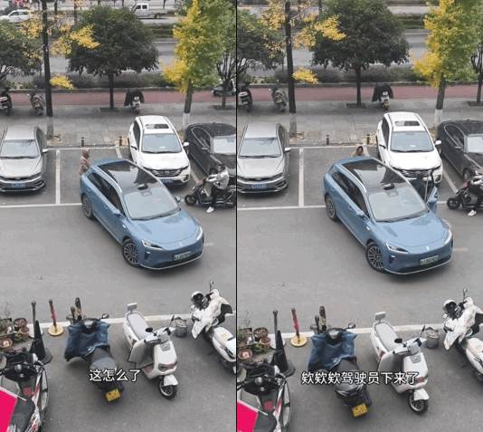 就在大媽猶豫要不要去找車主理論時,轎車已經完成了轉向,開始緩緩倒入車位。她這才恍然大悟——原來司機根本沒走遠,一直在遠端操控!等她想衝過去阻攔,車輛已經穩穩停進了車位正中。
