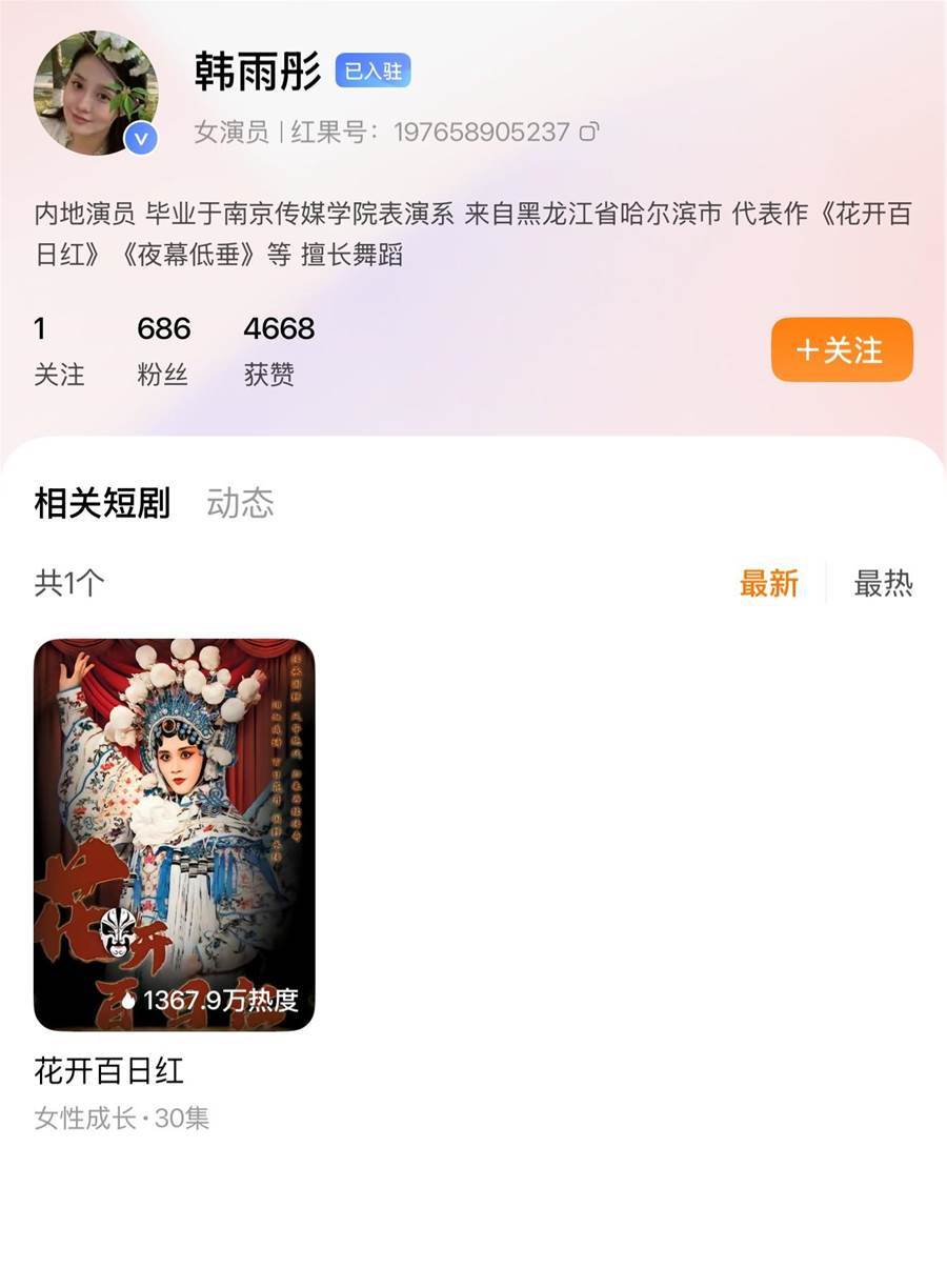 這位新人叫韓雨彤,是正經科班出身,畢業于南京傳媒學院表演系,二月份靠著《花開百日紅》裡的 「尚筱柔」 這個角色正式踏進短劇行業,本來是好好的起步階段,結果就因為一個名字,惹上了無妄之災。