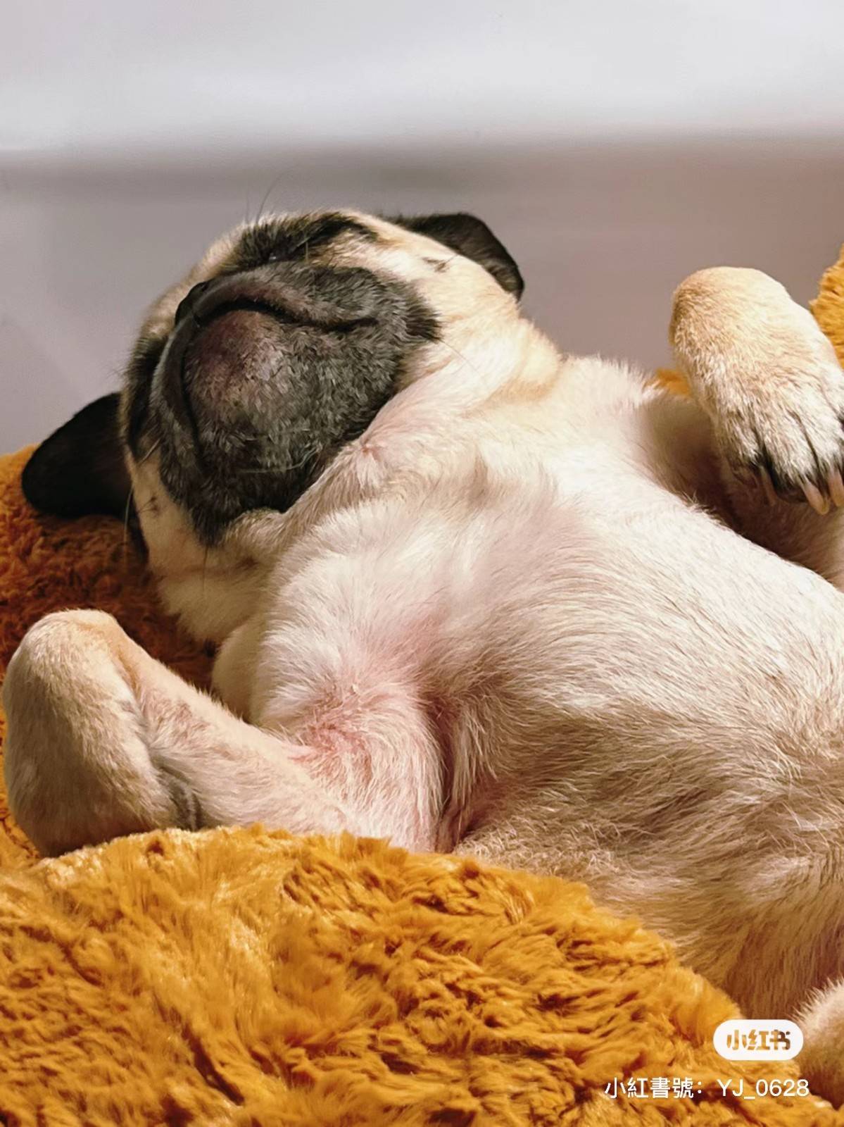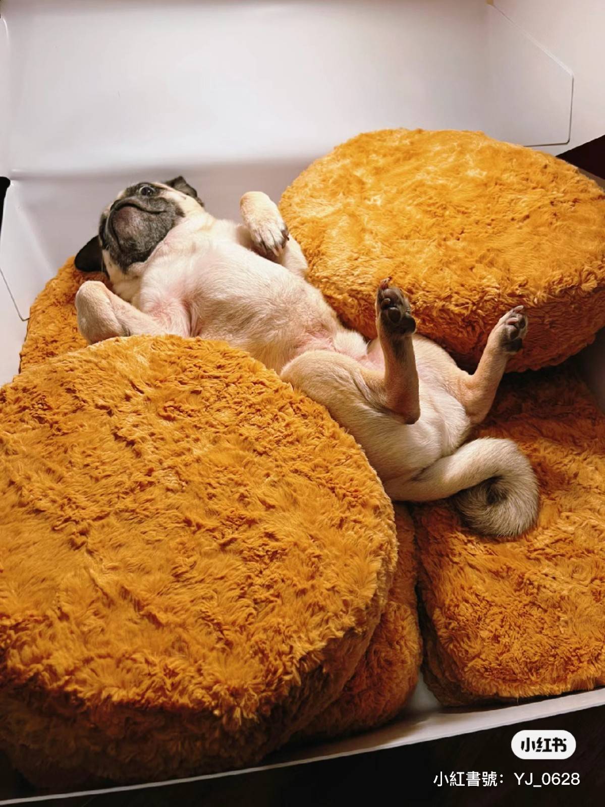 最好笑的是,被雞塊抱枕包圍似乎太溫暖了,巴哥直接在裡面四腳朝天,翻肚肚模樣實在太可愛了~
