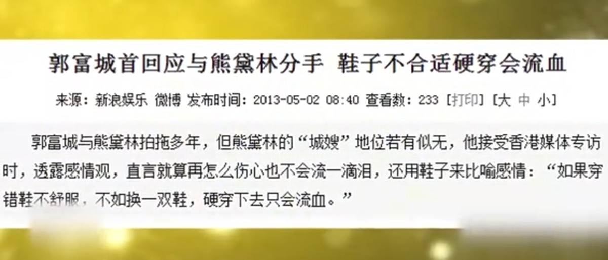 當年,郭富城一段「鞋子」言論,將陪了他7年的熊黛林推上風口浪尖。