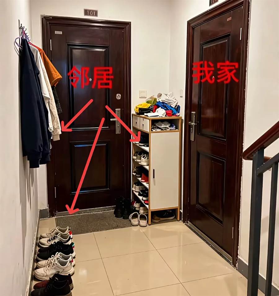 我家與鄰居的門間距不足兩米,這本該是守望相助的距離,卻因一個白色鞋櫃成了矛盾的導火索。自從鄰居將鞋櫃擺在兩戶之間的公共區域後,我家開門時常碰到櫃角,更令人困擾的是,越來越多的鞋子開始侵佔我家門前的空間。