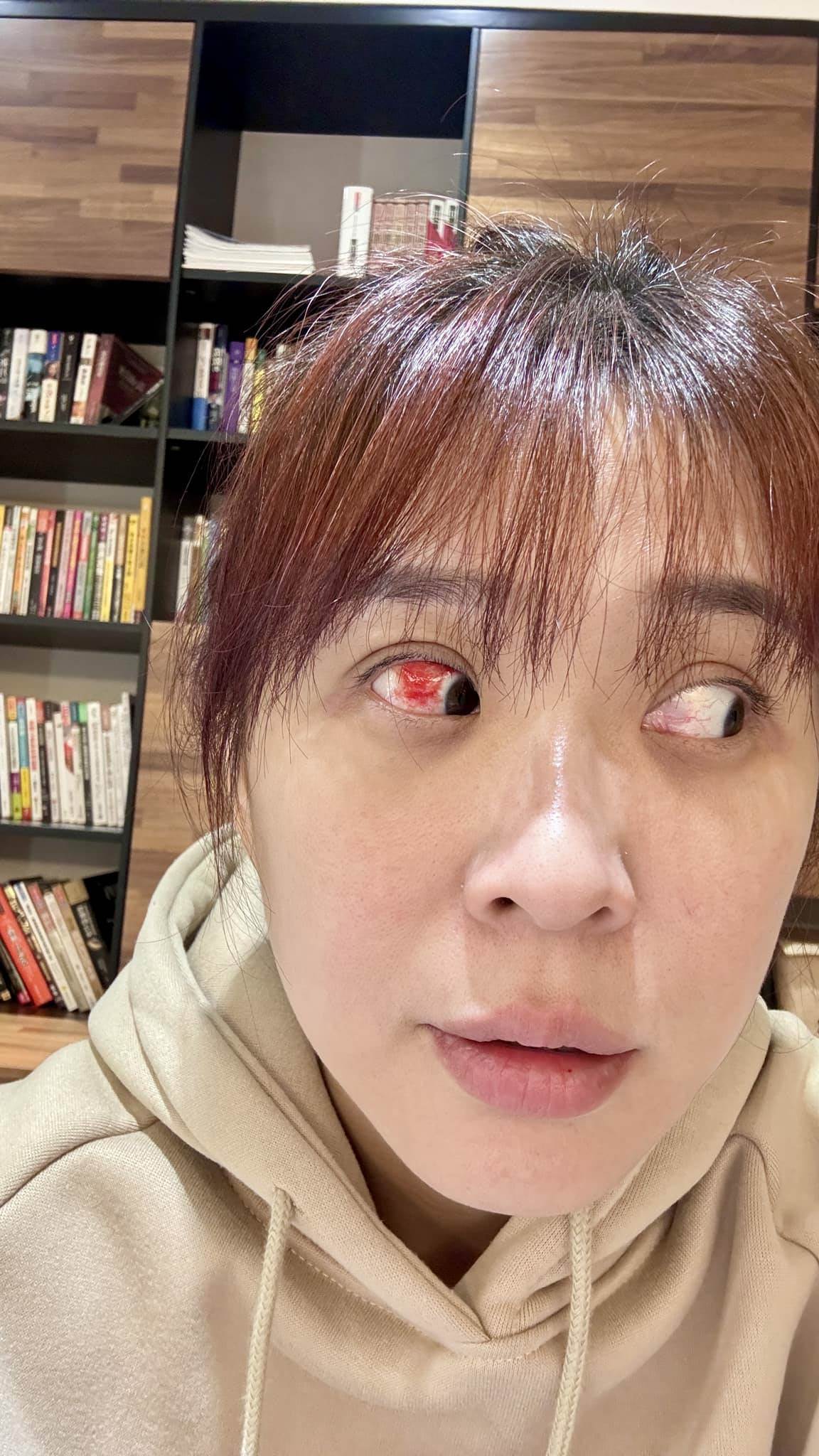 」果不其然,一回台灣就出現狀況,不僅全身肌膚大過敏,一顆顆抓到慘不忍睹,就連眼睛也出現不適,一下飛機立刻爆血管,苦笑喊話這是回國後美照第一發!