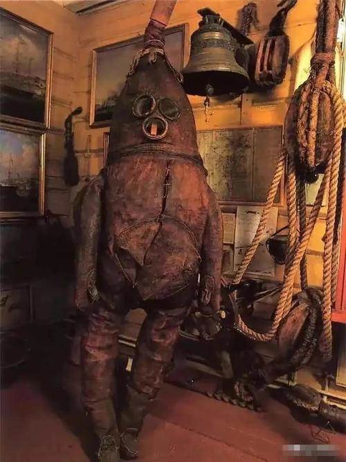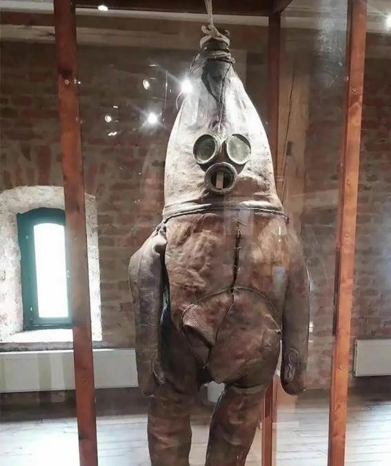 2017年,在芬蘭的一座博物館內,一位父親帶著他的女兒參觀時,女孩突然在一件展品前停下腳步,并開始大聲哭泣:「爸爸,我害怕。」 父親蹲下來想安慰,卻發現女兒的手指正指向玻璃展柜里那個「怪物」,1.8米高的牛皮軀體裹著黑色焦油,胸前三個鐵環像沒上漆的枷鎖,粗麻繩從肩部垂下來晃晃悠悠,看著確實有點讓人心里發毛。 周圍游客的目光也被吸引過來,有人小聲議論這到底是哪個年代的「刑具」,要不是旁邊有說明牌寫著「潛水服」,我怕是也得琢磨半天。