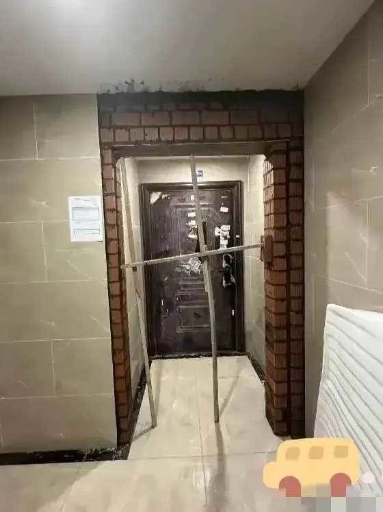 照片裡的景象讓人瞠目結舌——深色防盜門被一圈新砌的紅磚牆團團圍住,牆面粗糙的水泥痕跡還未乾透,幾根金屬桿橫在牆前,硬生生將公共樓道佔為己有。這就是新鄰居的「傑作」:將自家大門向外拓展兩米,公共空間成了私家前廳。