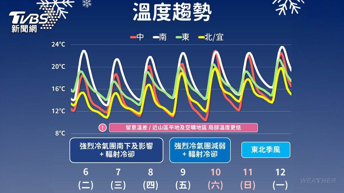 溫度方面,中北部及東北部白天最高僅能來到15度,中南部雖稍暖和些,也只有19至24度;花東則落在19至22度之間。入夜後至隔日清晨,各地低溫將降至11至14度,西半部因輻射冷卻效應加持,部分區域甚至可能跌破10度大關。