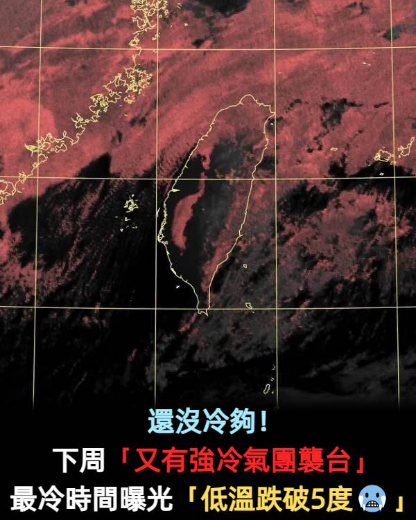 驚傳又有冷氣團要來了!受到強烈大陸冷氣團持續籠罩,全台將迎來一整週的低溫考驗。根據《TVBS新聞網》報導,氣象粉專「天氣風險WeatherRisk」主播忠瑋發出提醒,冷氣團影響期間,各地氣溫都將明顯下滑,普遍僅剩攝氏10度上下,北部與東北部更是寒意逼人,中南部的民眾也別掉以輕心,清晨及夜晚同樣冷颼颼。
