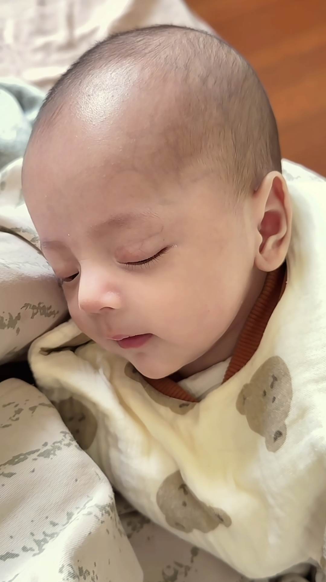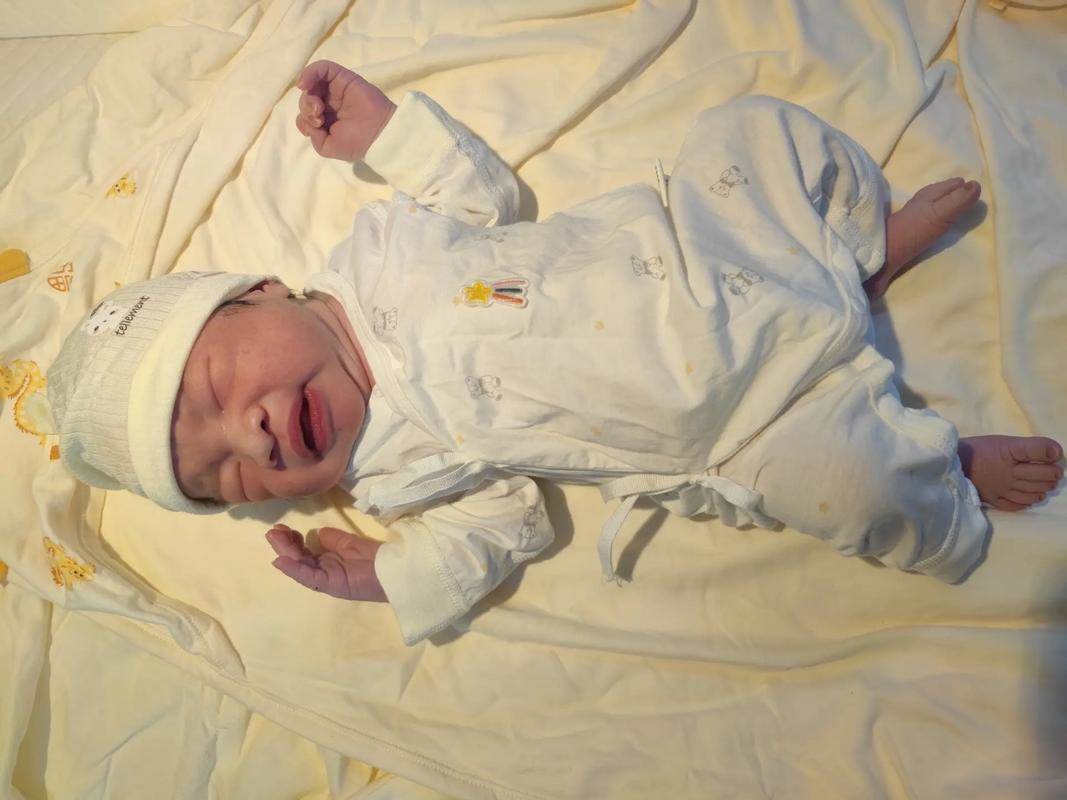 媽媽拍了孩子的側臉,按理說新生兒在順產出生的時候頭會被擠壓得暫時有點變形,但是這個孩子可能是剖腹產,他的頭還是比較圓的。