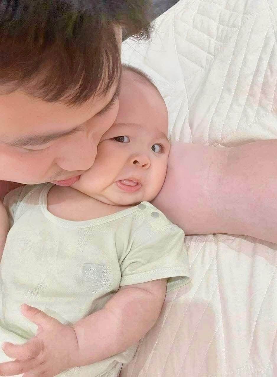 第一張照片,「和爸爸在一起」。畫面中,父親正溫柔地低頭親吻寶寶。他神情專注,嘴唇輕輕貼著寶寶的前額或臉頰,動作間充滿了慈愛與保護。寶寶則睜著圓溜溜的大眼睛,超級嫌棄。