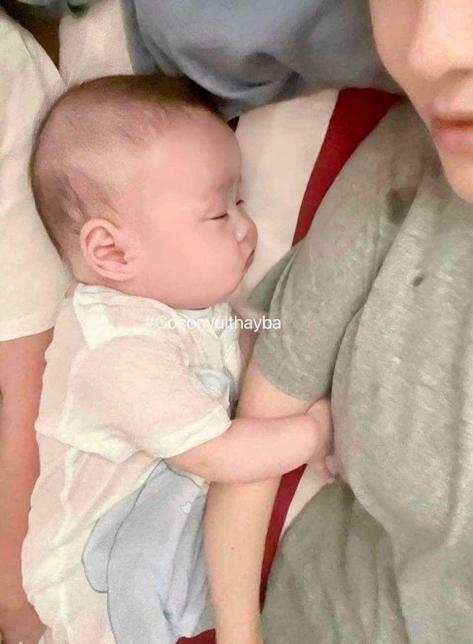 第二張照片,「和媽媽在一起」。畫面氛圍截然不同。寶寶已在成年人懷中沉沉睡去,閉著眼睛,表情完全放鬆,展現出絕對的安寧與信賴。他穿著可愛的連體衣,小身體完全依偎在抱著他的臂彎裡,兩隻小手甚至無意識地環抱著那只給予安全感的手臂。