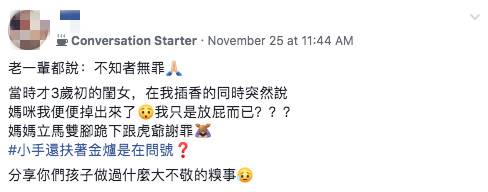 就在她想要開口詢問女兒時,空氣中突然飄來了一股臭味,再低頭一看,發現女兒一手扶著虎爺公的金爐,一手則遮著自己的屁股,滿臉無辜又無助地跟媽媽說,「我便便掉出來了…我只是放屁而已」。這句話馬上就讓原PO嚇歪了,也顧不得帶女兒去廁所,直接先雙膝跪下跟虎爺謝罪,不斷表示「不知者無罪」,希望神明可以原諒女兒如此失控的行為。