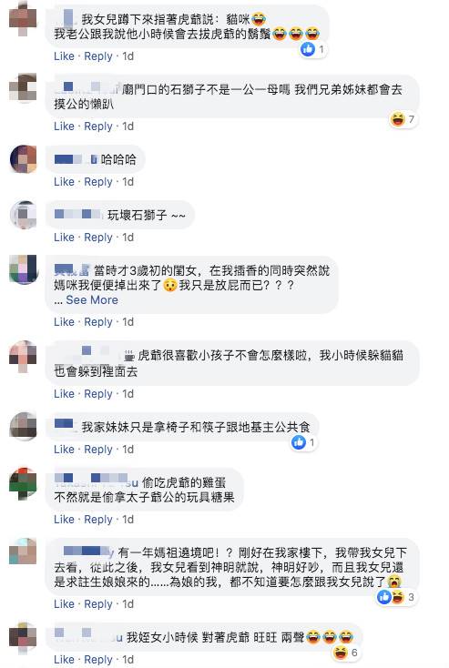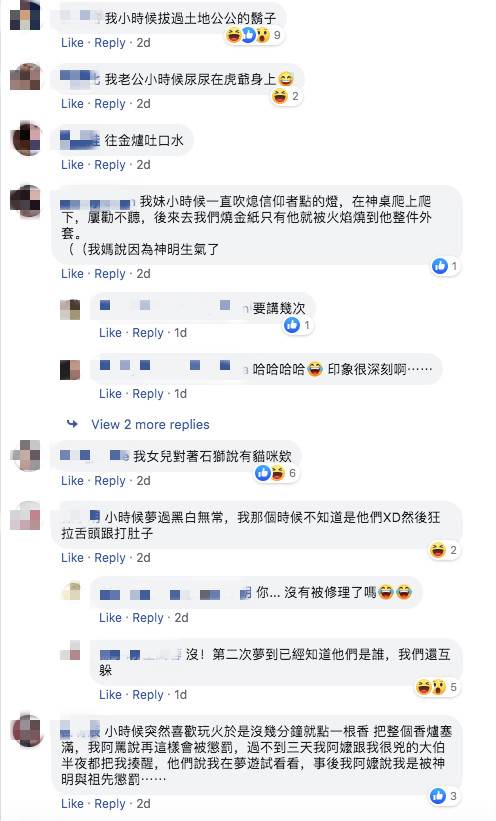 另外,也有不少人趁機分享自家小孩做過的糗事,「我家2歲半的把虎爺的香爐倒掉,說太髒了要洗,我整個當場差點暈倒」、「我女兒不小心把虎爺牌坐在屁股下」、「我小時後還偷吃過虎爺的東西,然後又在香爐上寫號碼汙賴給虎爺,結果我阿嬤真的相信了,拿號碼去簽阿樂」。