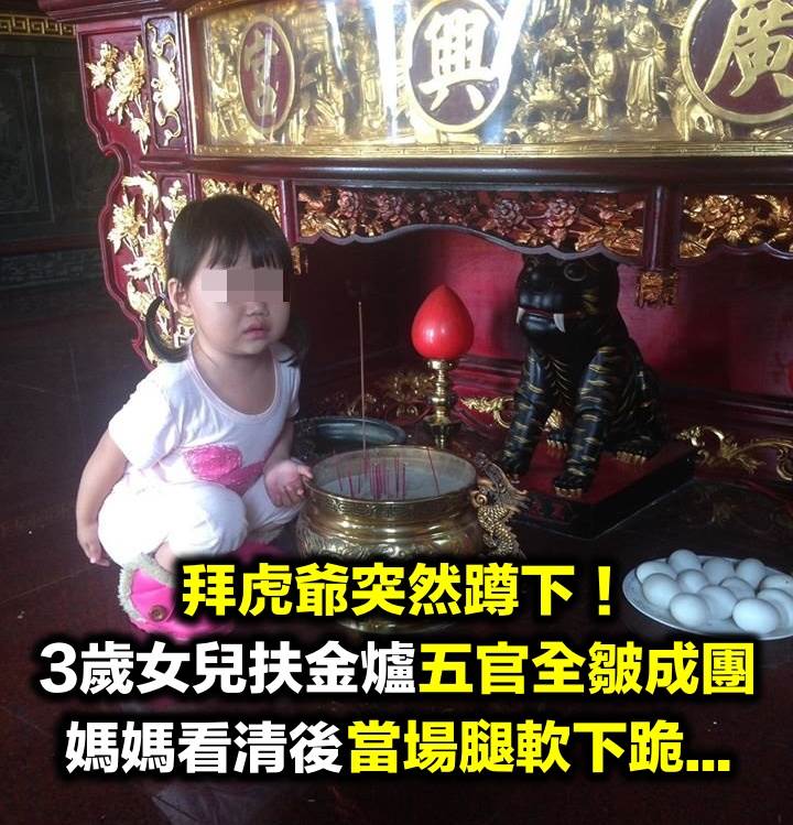 在台灣,大部分民眾都有自己的宗教信仰,並且一般都會認為,必須對神明心存敬意,尤其踏入寺廟或拜拜時,更應該循規蹈矩,不得隨便開玩笑、做出無理的行為。不過臺南卻有一位媽媽透露,日前自己帶著3歲的女兒到宮廟裡拜拜,結果拜到虎爺公時,女兒竟突然在金爐前蹲了下來,還露出一臉做錯事的模樣,讓她心裡一緊,當場腿軟跪下來謝罪,直呼:「不知者無罪!」