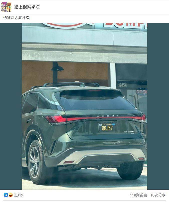 有網友在臉書社團《路上觀察學院》附圖註解:「怕被別人看沒有。」一輛LEXUS黑色轎車的車牌色系低調,黑底黃字相當簡約,不過車牌號碼「08J57」卻引起眾多台灣人的關注,懂的人馬上就笑了。