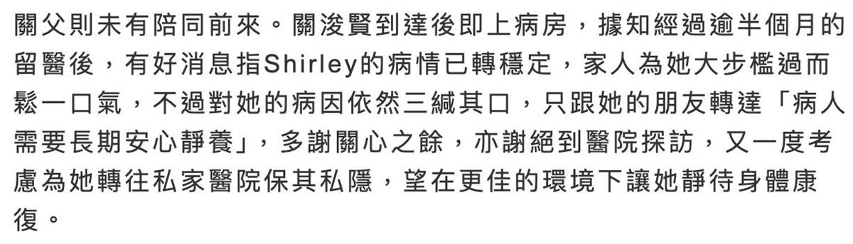 關淑怡的家人沒有透露關淑怡的病情,不過有向友人傳達穩定的消息,也就是說如今關淑怡雖然還在ICU但是情況已經穩定了下來,但是基于還是要長期安心靜養,所以其家人還是不方便接待,謝絕到醫院探望。