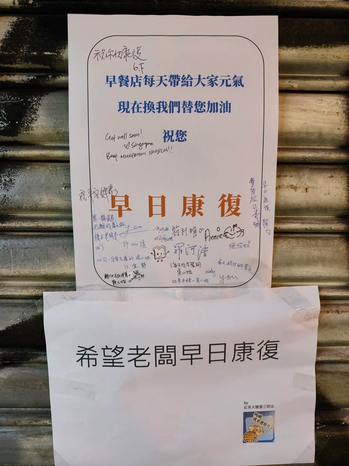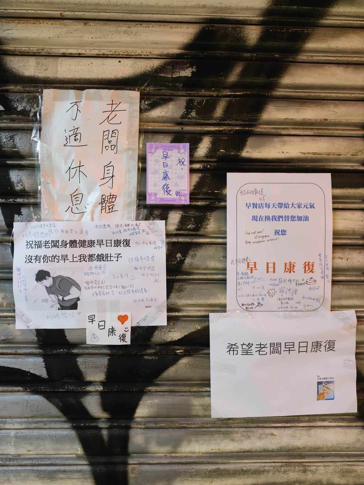 走近一看,整面鐵門就像一張巨大的祝福卡片。有用彩色筆手寫的貼紙:「老闆身體健康早日康復,沒有你的早上我都餓肚子」,旁邊還畫著可愛的笑臉太陽。還有用電腦印製的精美卡片,寫著英文祝福:「Happy May Your Life Be Long」。