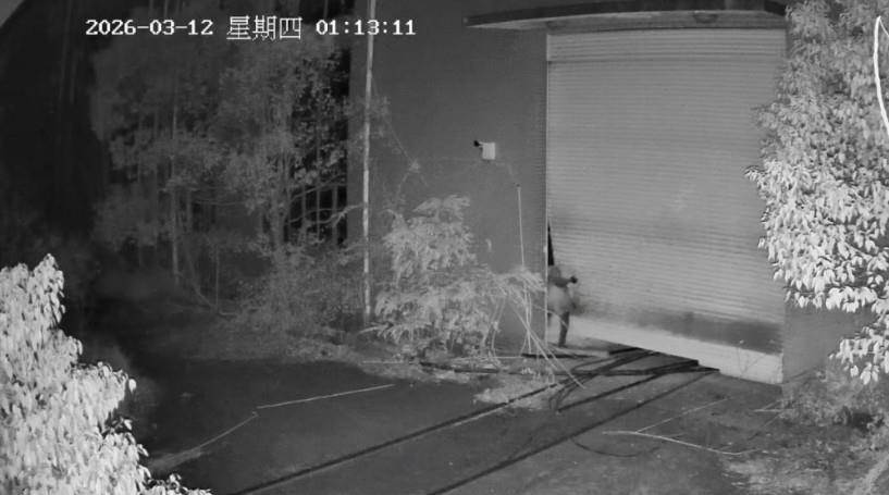 從影片中可以看到,事發在3月12日深夜,一名頭戴頭燈的男子撬開工廠大門鐵閘後,從一側鑽入廠區,進入不久,工廠內突然傳出淒厲陰森的「女鬼笑聲」,聲音高亢刺耳,讓人毛骨悚然。他聽到詭異聲音,一度停下腳步四處張望,試圖確認聲音來源,但始終沒有發現任何人影,面對持續傳出的恐怖笑聲,嚇得放棄行竊,沿原路逃離工廠。