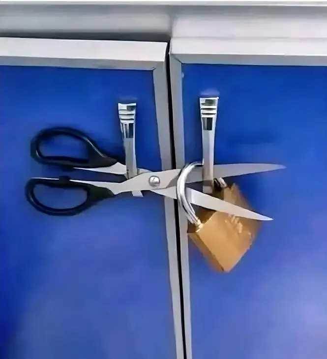 公司新來的同事小陳,第一天上班就遇到了個棘手難題。當他興沖沖地準備整理新分配的儲物櫃時,眼前的一幕讓他愣住了——兩扇灰色的櫃門之間,竟被一把銀色大剪刀橫穿而過,剪刀手柄處還牢牢掛著一把黑色掛鎖。這奇怪的裝置,將櫃門緊緊「鎖」在了一起。