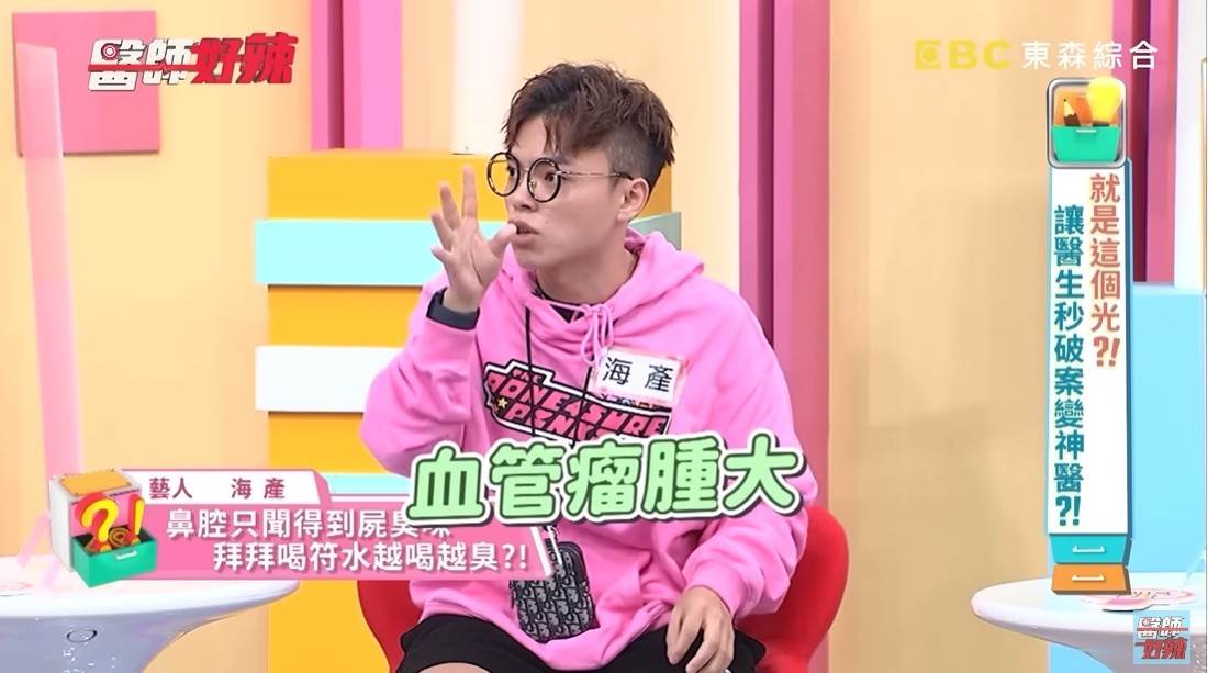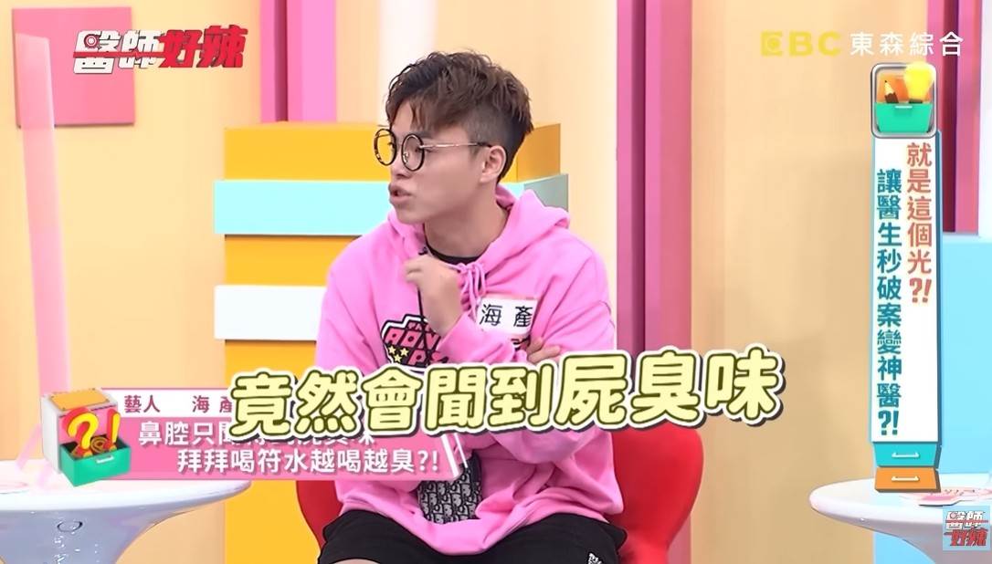 海產透露自己只要感冒就很容易流鼻血,久而久之「一流血就聞到腐爛的味道」,崩潰的他問了身邊的朋友,大家都說沒有聞到,讓他不禁懷疑是不是自己卡到陰?會有這樣的想法,源自于他出身在非常傳統跟保守的家庭,當時阿嬤聽到他的情況後,二話不說就帶他去廟宇給住持看,沒想到對方一見到他就說:「你卡到了,卡很深。」緊接著對他吐滿臉的酒水,還要他照三餐喝香灰水來化解。