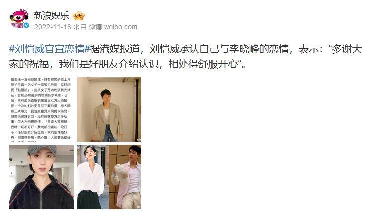 2022年11月,劉愷威幾次被拍到與李曉峰甜蜜出行,于是就干脆承認了戀情。