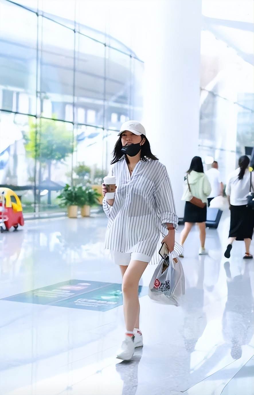 她媽媽趙薇那天也穿得很簡單,條紋襯衫,白色短褲,戴個帽子和口罩。