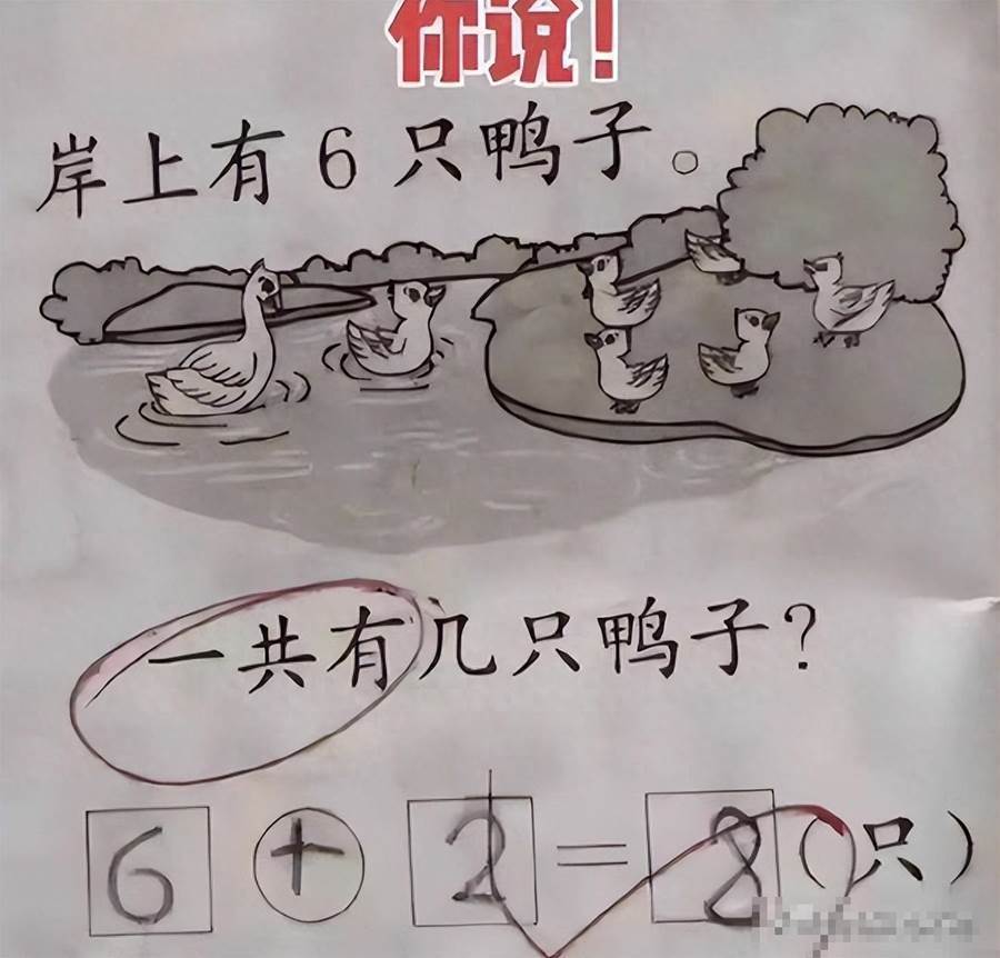 直到看到兒子作業本上那道「岸上6只鴨子,水中2只,共幾只」的題目,她徹底懵了,兒子寫的「6+2=8」被畫了紅叉,旁邊還寫著「全班僅錯這一道」。