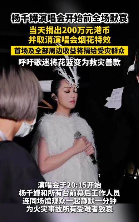 楊千嬅第一時間捐款200萬港元,29號在自己出道三十周年演唱會上,又宣佈將首場演唱會收益、以及近期六場演出的周邊銷售收入,全部投入災後重建。