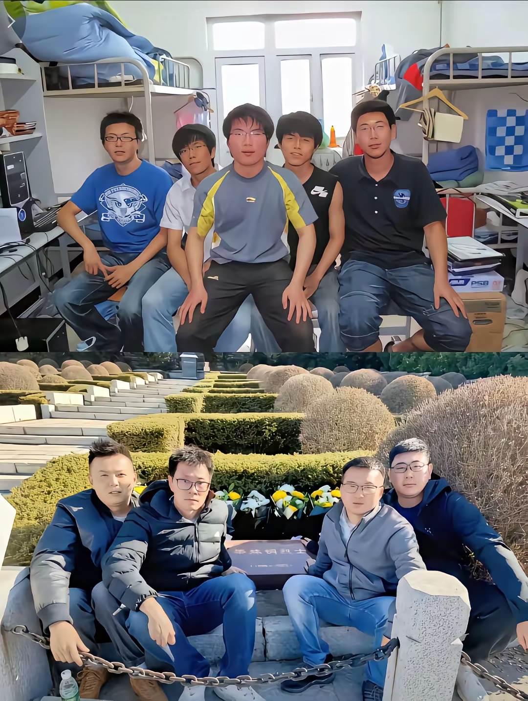 上半部分的宿舍合影裡,五個少年肩並肩擠在鏡頭前,身後是熟悉的鐵架床、凌亂的書桌和閃爍的電腦屏幕。他們穿著最簡單的T恤,笑容裡有種未經世事的明亮。右二那個穿黑色無袖背心的男生,笑得尤其開懷,手臂隨意搭在身旁兄弟的肩上。