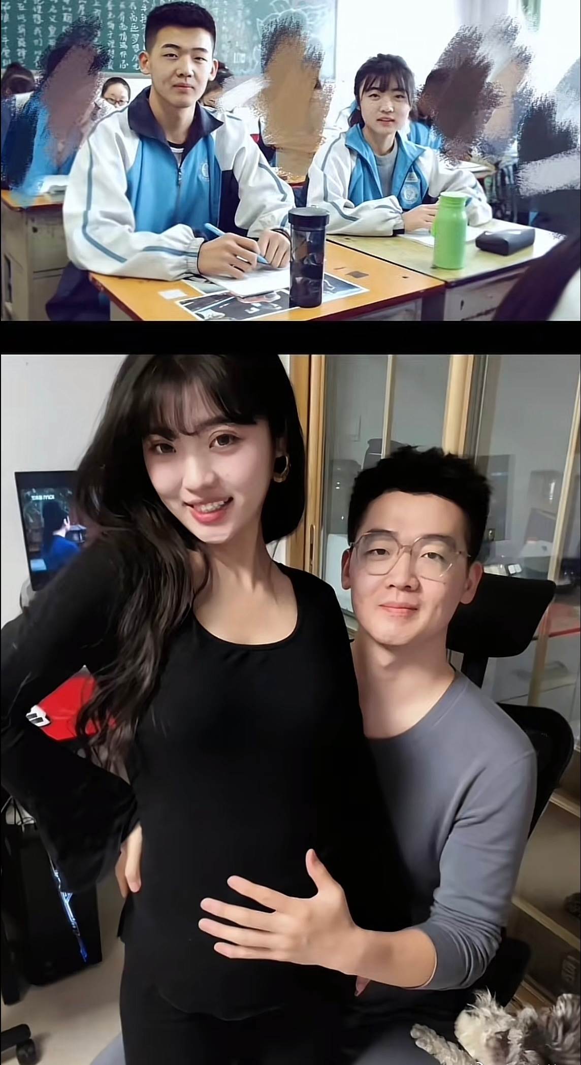 這句話連線了上下兩張照片,也連線了從校服到婚紗、從青春到成熟的漫長歲月。它宣告了一個夢想成真的故事:那個在懵懂年紀裡,與自己共享一方課桌、一起解過難題、傳過紙條的女孩,最終沒有走散在茫茫人海,而是成為了他生命中的另一半,如今更即將共同迎來愛情的結晶。