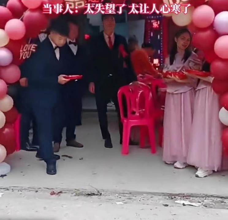更令新郎感到心寒的是,連他的父親竟然也沒有出席婚宴,看著空蕩蕩的會場,新郎孤伶伶地站在自家氣球拱門前,數度望向天空「無語問蒼天」,就連一旁的伴郎、伴娘和其他工作人員也神情落寞不然就是臭臉。據了解,新郎的父親是因為在外地工作太忙,過去家鄉的喜喪事都未曾參與過,但連兒子的婚事都錯過,無疑是給孩子心裡一記重擊,讓新郎忍不住長嘆「心都涼了……」