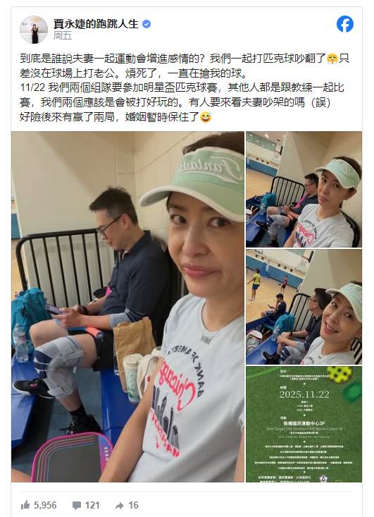 根據《ETtoday星光雲》報導,賈永婕近日和老公一起打匹克球,原以為運動會增進感情,怎料卻演變成爭執。賈永婕抱怨老公在場上不斷搶走她該接的球,這個舉動讓她感到相當煩躁。她在文中用「煩死了」三個字,充分表達出當下被激怒的心情。