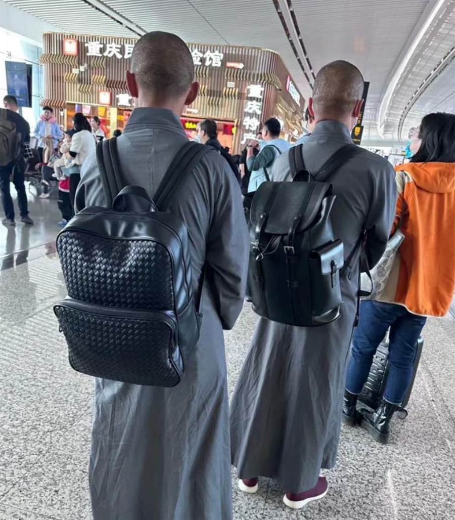 一名網友日前在臉書社團爆廢公社PO出一張照片,畫面中,只見兩名剃著平頭、身穿灰色僧服的和尚,但兩人身上卻都背著精品品牌的後背包,讓原PO驚訝直呼:「是高配版和尚!」原PO更曬出兩款包包的官方價格,右邊一款是法國精品LV的皮革後背包,當時官網價格約新台幣14.
