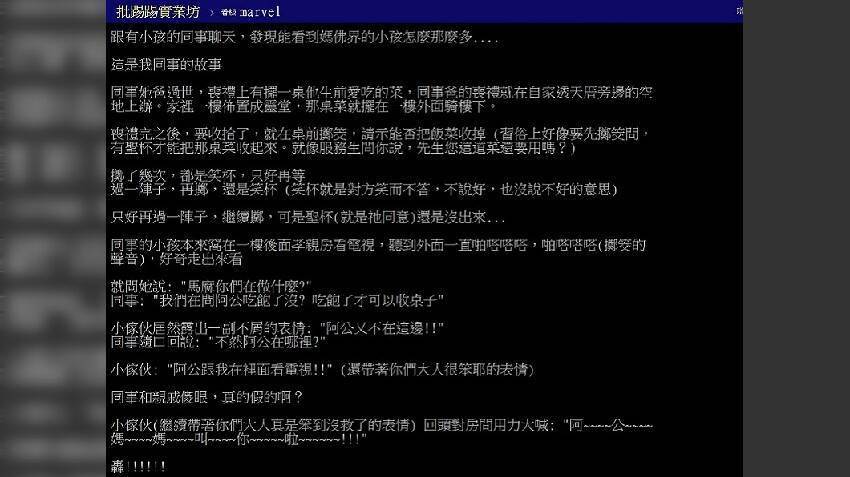 據《三立新聞》報導,由于同事一直擲到笑杯,大家都不敢收菜,原本在房間內看電視的同事兒子,聽到大家一直在外面擲筊,便童言童語問「媽媽你們在做什麼?」,同事則告訴孩子「我們在問阿公吃飽沒?示意圖來源:爆料公社