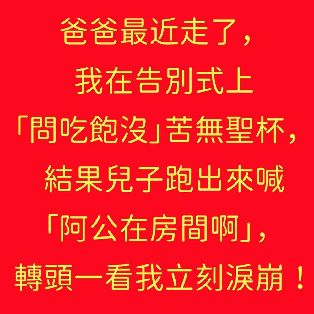吃飽了才可以收桌子」,這時兒子露出相當不解的表情,直接說「阿公又不在這邊!」,讓全部人聽了滿頭問號,同事便問兒子「那阿公在哪裡?」,他回答了一個讓人意想不到的答案「阿公跟我在房間看電視!」