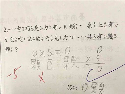 該題目為「一包巧克力有8顆,桌上有5包吃完的巧克力,一共有幾顆?」許多人一看到題目都會直觀以為老師是在考九九乘法,因此都會非常直觀地認為是8X5=40的答案,但老師卻打上一個叉,並寫上正確解答其實是0顆,因為題目中有特別強調是「吃完的巧克力」,讓大批網友傻眼直喊根本是在考驗邏輯。