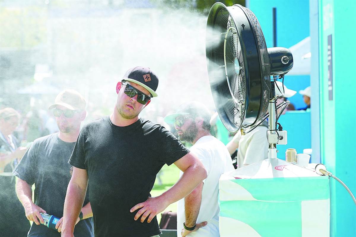 球迷在霧化風扇前降溫消暑。 (視覺中國)
