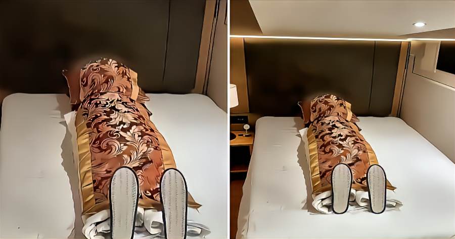 影片開頭就帶著戲謔的文字:「準備退房了,給客房阿姨留個驚喜」,但鏡頭一轉,床鋪的模樣卻讓人頭皮發麻 —— 被子被仔細疊成人體輪廓,枕頭擺出上半身的形狀,床尾還整整齊齊擺著一雙拖鞋,從門口遠遠望去,活像一個人平躺在床上,連被子的褶皺都刻意模仿人體曲線,乍一看根本分不清真假。