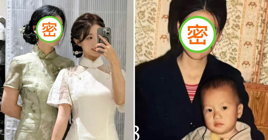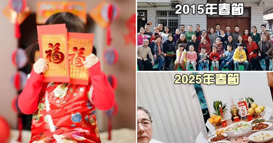 十年後,同樣的姿勢,同樣的兩個人,甚至背景中的紅色窗花依然貼在原處,但男子的笑容卻不見了。取而代之的是一張面無表情的臉龐,眼神中透露出難以掩飾的疲憊與滄桑。