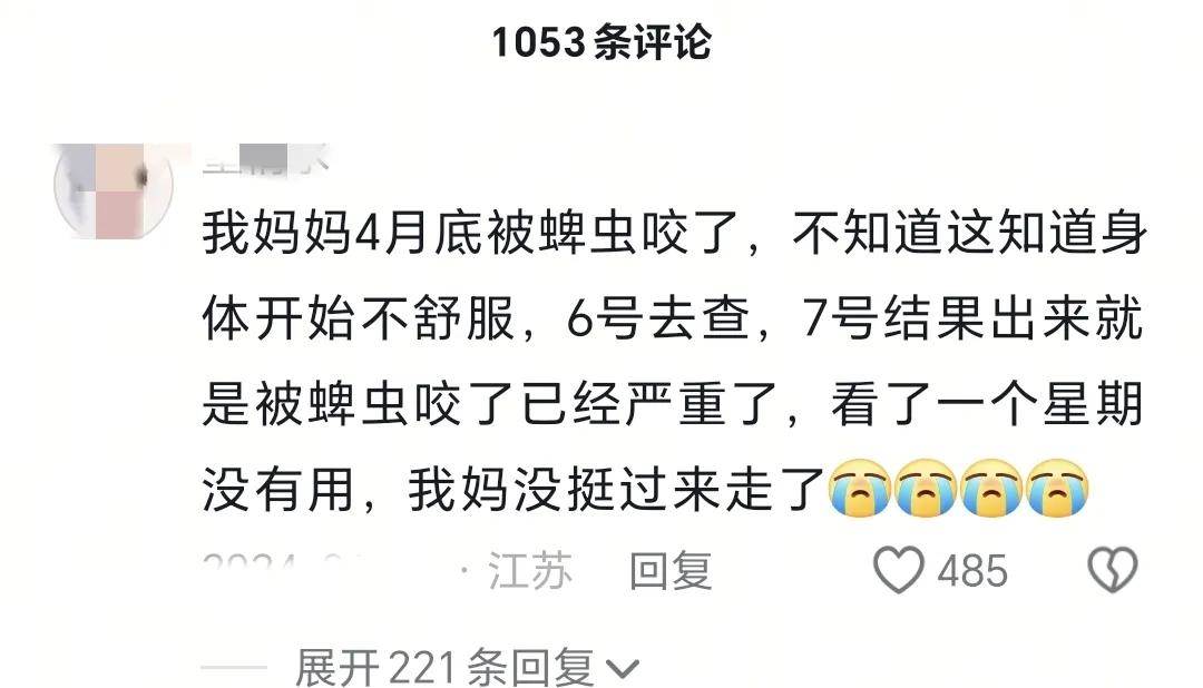 然後一個網友說自己的媽媽在4月底被蜱蟲咬了,一個星期這樣就去世了。