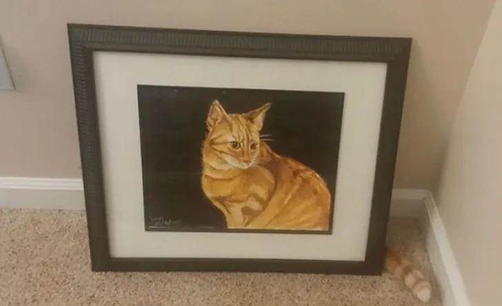 六、我家淘氣的小貓咪跑到了油畫的后面,剛好給油畫中的小貓添了一條尾巴