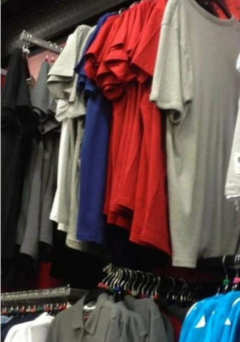 九、這個攤位主把紅色的短袖掛出了一張人物的肖像,他自己還不知道呢