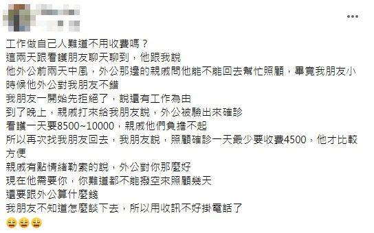 原PO的朋友最後拒絕了,因為他還有工作在身,沒想到晚上手機響起,親戚在那頭表示,照護費用高達8500元到1萬元,他們根本負擔不起,希望身為孫子的他,別這麼絕情。于是,原PO朋友退讓回說,自己最少一天要收費4500,結果親戚朋友聽不下去,直接搬出「親情牌」,口氣毫不客氣!