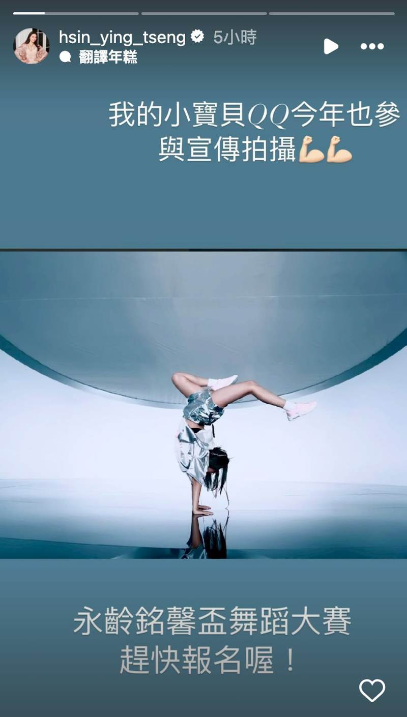 曾馨瑩透過Instagram限時動態分享了更多QQ的精彩表現。只見這位小小舞者展示了一連串令人驚嘆的高難度動作,包括完美的倒立、優美的下腰,以及高難度的空中劈腿。