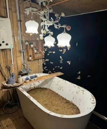 照片中的浴室,白天顯得宛如人間仙境。一個擺放在木屋中的獨立浴缸,搭配著白色紗簾,窗外是茂密的山林,屋裡燈光彩照人,彷彿隨手一拍都是大片。但當夜幕降臨,情況卻急轉直下。同一地點,紗簾之外是一片漆黑,白天清新的氛圍被密密麻麻的飛蛾所取代。成群的飛蟲圍繞著浴缸,燈光下更是顯得格外駭人,場景完全超出了遊客的預料。