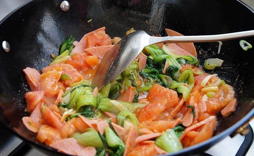 食材:手搟面、番茄、油菜、火腿腸、油、鹽、五香粉、蔥、生抽、白糖、香醋、蠔油各適量。