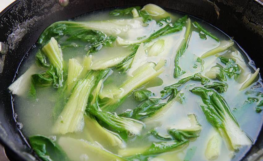 油菜洗凈,放入煮面條的湯中燙一下,撈出過冷水攥掉水分。